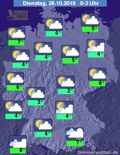 Im Süden überwiegt in der Nacht ein Mix aus wechselnder und starker Bewölkung; an den Alpen können zeitweise Schauer fallen, sonst bleibt es trocken.