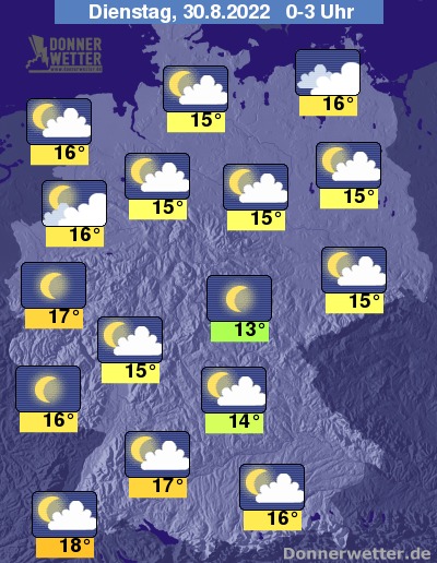 In der Nacht auf Dienstag zeigt sich der Himmel meist nur gering bewölkt oder es ist sternenklar. Dichtere Wolken halten sich in den nächsten Stunden in erster Linie über dem Norden Deutschlands. Es bleibt trocken.
