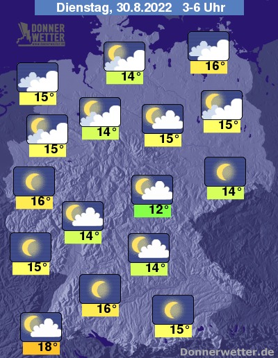Die Temperaturen erreichen in den Frühstunden Werte um 14 Grad in Erfurt und 18 Grad in Stuttgart.