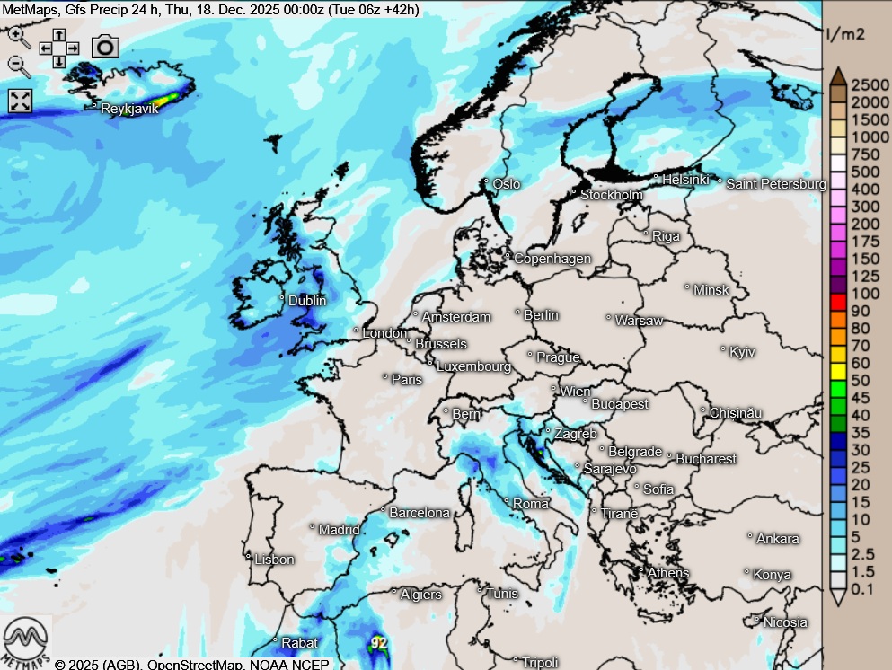 Die Strömungs- / Temperaturkarte für Mittwochfrüh (06:00 Uhr) sowie die 24-Stunden-Regenmengen für Europa nach GFS: