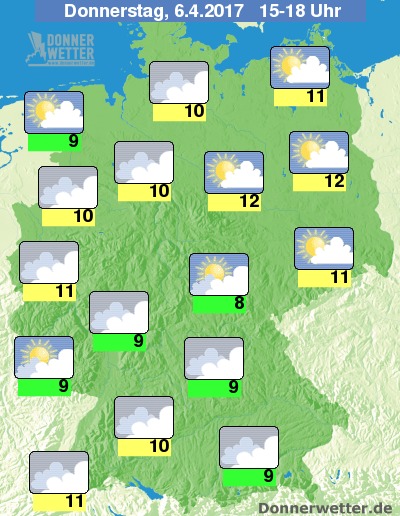 Das Wetter am Donnerstag Nachmittag zeigt sich weitgehend trocken über der Bundesrepublik. Der Nord- und Südwesten sind die meiste Zeit über bedeckt. Im Nordosten zeigt sich das Wetter dagegen heiter. Die Temperaturen liegen bei Werten zwischen 7 Grad C bis 11 Grad C in der Hauptstadt.