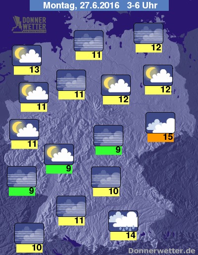 In der Nacht zum Montag fällt im Südosten bei dichten Wolken weiterer Regen. Im übrigen Land ist der Himmel verbreitet nur leicht bewölkt oder sternenklar. Im Osten ist es hingegen meist stark bewölkt, aber ebenfalls trocken. Die Temperatur sinkt auf 15 Grad in Dresden und etwa 9 Grad am Hunsrück.