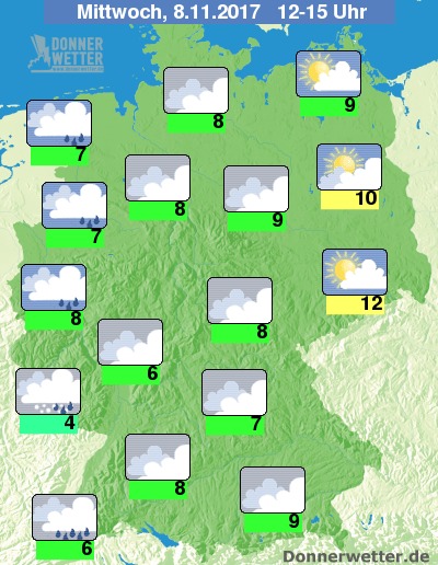 Heute Nachmittag ist es von der Ostsee bis nach Sachsen oft locker bis aufgelockert bewölkt. Sehr dichte Wolken mit zeitweiligem Regen, teils auch Schneeregen ziehen über die westlichen Landesteile hinweg. Über dem übrigen Bundesgebiet ist es ebenfalls meist dicht bewölkt, dazu fällt aber nur hier und da etwas Regen, zumeist bleibt es trocken. Die Temperatur liegt bei 4 Grad am Pfälzer Wald und bis 12 Grad in Dresden.