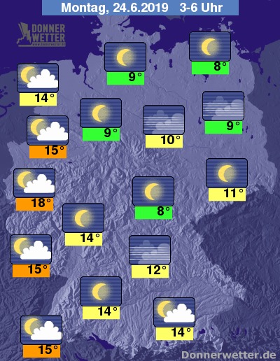 In der folgenden Nacht ist der Himmel zunächst fast landesweit sternenklar, in den westlichen Landesteilen ziehen im Laufe der Nacht einige, weitgehend jedoch nur lockere Wolken durch, dazu bleibt es trocken. Die Temperatur sinkt auf 18 Grad in der Kölner Bucht und bis 8 Grad im Eichsfeld.