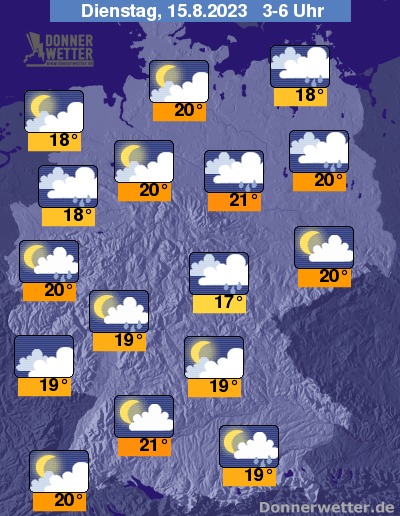 In der folgenden Nacht zeigt sich der Himmel zeitweise locker, zeitweise aber auch dicht bewölkt. Es können sich gebietsweise Schauer, örtlich auch Gewitter entwickeln. Die Temperatur sinkt auf tropische 21 Grad in Stuttgart und bis etwa 17 Grad in Jena.