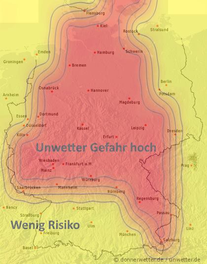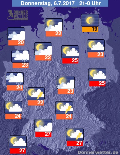 Zu Beginn der Nacht lassen die Gewitter vor allem im Westen nach, stattdessen setzt jedoch vor allem im Emsland und Münsterland leichter Regen ein. Zwischen Taunus und Bayerischem Wald kommt es auch dann vereinzelt noch zu Gewittern.