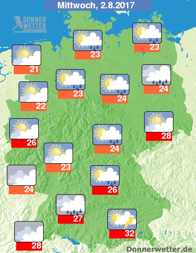 Am Mittwoch zeigt sich das Wetter zum Teil aufgelockert, oft jedoch auch stark bewölkt. In den westlichen Landesteilen bleibt es mehrheitlich trocken, sonst bilden sich hingegen gebietsweise Schauer, im Süden und Osten auch örtliche Gewitter. Die Temperatur steigt auf 21 Grad in Emden und bis 32 Grad in München.