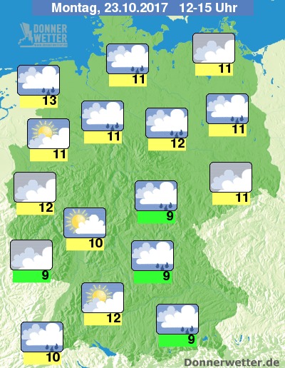 Heute Nachmittag halten sich über der Bundesrepublik überwiegend dichte Wolken, Auflockerungen sind nur selten möglich, dabei vor allem im Westen und Südwesten, hier bleibt es auch meist trocken, sonst fällt hingegen gebietsweise Regen. Die Temperatur steigt auf 9 bis 13 Grad.