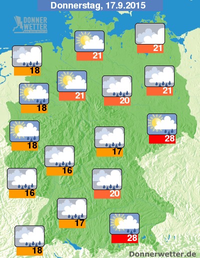 Am Donnerstag gibt es zumeist einen Wechsel aus Auflockerungen und dichter Bewölkung, dabei fällt besonders von der Mitte bis in den Südwesten Deutschland häufig Regen, dabei sind die Niederschläge zum Teil auch kräftig, langanhaltend und ergiebig. In den anderen Landesteilen fällt zeitweise Regen. Im Norden bleibt es jedoch überwiegend trocken. Die Temperatur steigt auf kühle 16 Grad am Pfälzer Wald und bis auf sommerliche 28 Grad an der Neiße. Im Norden weht teils starker bis stürmischer Wind mit möglichen Sturmböen, an Nord- und Ostsee herrscht zum Teil auch Sturm.