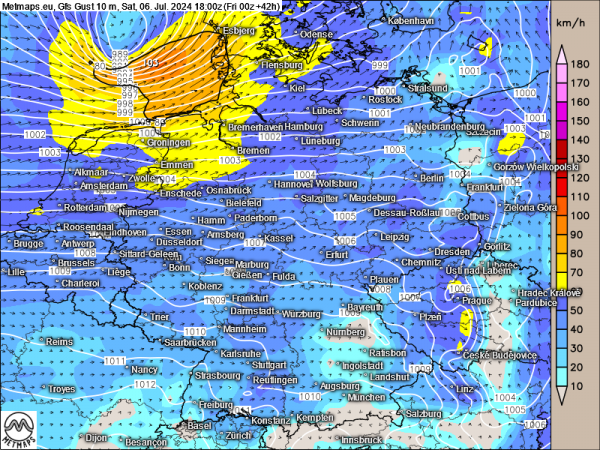 Am Samstag breitet sich von Südwesten teils schauerartiger Regen ost- / nordostwärts aus. Auch im Nordwesten bei starker Bewölkung teils gewittriger, schauerartiger Regen. Im Süden und Osten startet der Samstag zunächst noch mit geringer Bewölkung, im Tagesverlauf sind dann auch hier bei zunehmender Quellbewölkung Schauer und lokal kräftige Gewitter möglich. Örtlich besteht ein erhöhtes Unwetterrisiko!