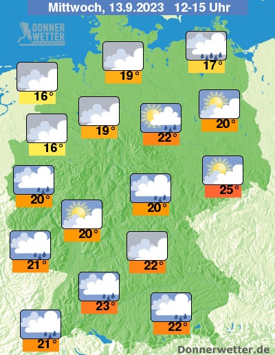 Heute Nachmittag zieht überwiegend starke bis dichte Bewölkung durch, dabei bilden sich vor allem südlich des Mains und im Osten gebietsweise Schauer, vereinzelt auch Gewitter. Im Norden und Westen bleibt es meist trocken und es kann auch stellenweise wieder aufheitern. Die Temperatur liegt bei 16 Grad an der Ems und 25 Grad an der Neiße.