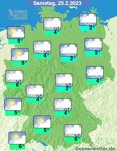 Am Samstag ist es nach Westen hin gebietsweise heiter und trocken, über der Osthälfte halten sich dagegen meist dichte Wolken und es bilden sich gebietsweise Schneeschauer, teils fallen die Niederschläge auch als Schneeregen oder Regen. Die Temperatur steigt auf 2 Grad in Berlin und bis 6 Grad in Köln. An der See weht ein oft stürmischer Wind.