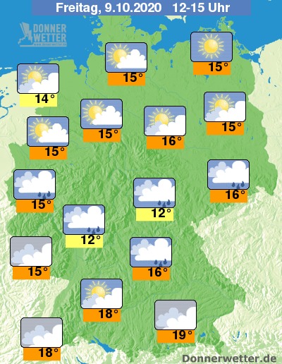 Die Temperaturen bewegen sich zwischen kühlen 12 Grad unter den Regenwolken über der Landesmitte und nahe 20 Grad im Süden.
