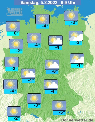 Die Temperaturen liegen in den Frühstunden bei Werten um -6 Grad im Thüringer Becken, -3 Grad an der Spree und um 0 Grad in Ostfriesland.