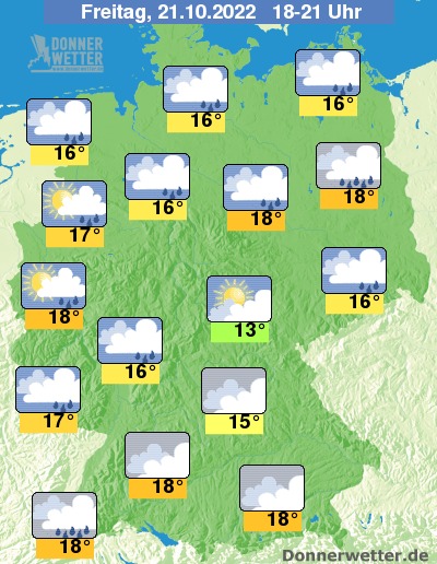Heute Abend lässt der Regen über Deutschland immer mehr nach, vor allem im Norden, Osten und im Südwesten fällt jedoch noch vielerorts Regen. Bis auf seltene Auflockerungen, vor allem am Niederrhein bleibt es verbreitet bei dichten Wolken. Die Temperatur liegt bei 13 Grad in Jena und 18 Grad in München.