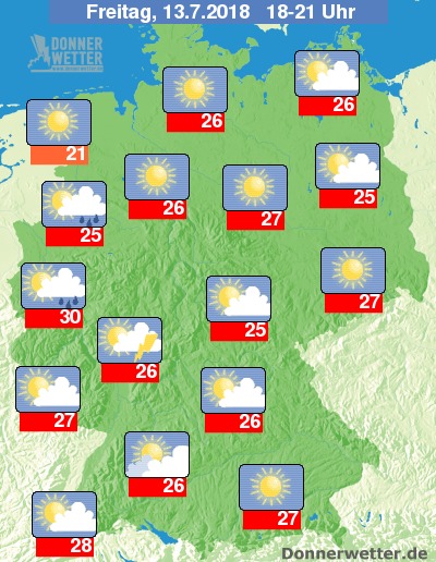 Heute Abend sind über der Eifel und am Niederrhein lokale Schauer und Gewitter möglich, ansonsten scheint über dem Land verbreitet die Sonne und es ziehen meist nur lockere Wolkenfelder durch. Besonders über der Nordhälfte ist es auch häufig wolkenlos. Die Temperatur liegt bei 21 Grad an der Nordsee und bis 30 Grad in der Kölner Bucht.