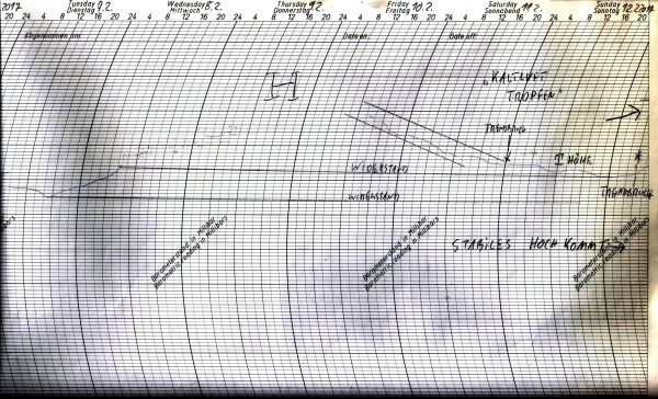 Unser Schrieb zeigt den Luftdruckverlauf an unserer Wetterstation in Bonn zwischen dem 07.02. und 12.02.2017. Gut zu erkennen ist unter anderem der Kaltlufttropfen, der am Wochenende dem Westen und Südwesten vereinzelte Niederschläge brachte.