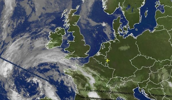 Zwischen einem Tief über der Nordsee und einem Hoch über Mitteleuropa fließt trockene Luft nach Deutschland ein. Das Tief ist gut auf unserem Satellitenbild von heute Vormittag zu sehen.