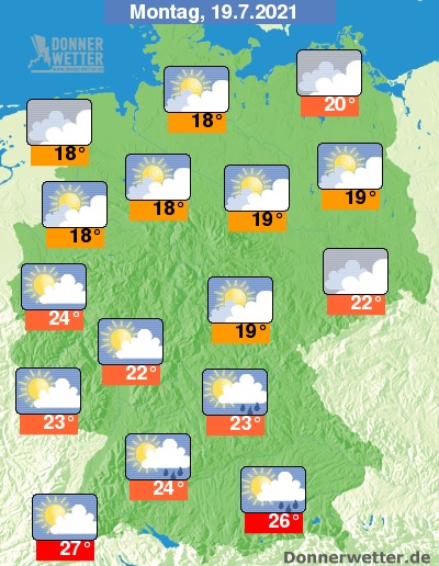 Am Montag ist es im Norden häufig stark, oft auch aufgelockert bewölkt. Weiter nach Süden hin ist es verbreitet heiter, gebietsweise ziehen aber auch einige, teilweise auch dichte Wolken durch, dazu können sich im Süden vereinzelt Schauer bilden. Im übrigen Land bleibt es trocken bei Höchstwerten von 18 Grad in Hamburg und bis 27 Grad in Freiburg.