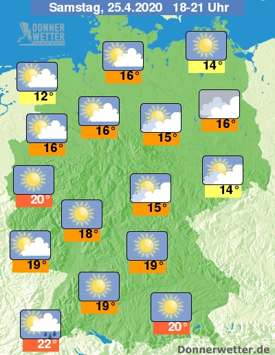 Heute Abend ist es weiterhin oft sonnig oder locker bewölkt, hier und da können aber auch mal einige und teils dichte Wolken durchziehen. Direkt am Alpenrand sind einzelne Schauer möglich, sonst bleibt es aber trocken. Die Temperatur liegt anfangs bei 12 Grad an der Nordsee und bis zu 22 Grad in Freiburg.