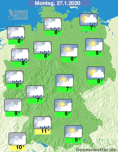 Am Montag ziehen aus Westen kompakte Wolken mit Regen zunächst in die westlichen Landesteile und im Tagesverlauf auch etwa bis hin zur Landesmitte. In den östlichen Landesteilen ist es  zunächst noch meist wechselnd bis aufgelockert bewölkt und bis zum Abend hin noch weitgehend trocken. Die Temperatur steigt auf milde Werte zwischen 7 Grad in Rostock und bis 11 Grad in Karlsruhe.