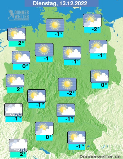 Am Dienstag zeigt sich der Himmel über weiten Landesteilen nach Auflösung möglicher Nebel- oder Hochnebelfelder heiter oder nur leicht bewölkt, teils sind auch längere sonnige Abschnitte möglich. Von Südwesten bis in die Mitte nimmt die Bewölkung im Tagesverlauf zu, am Nachmittag und Abend sind hier dann leichte Schneefälle möglich. Sonst bleibt es meist trocken.