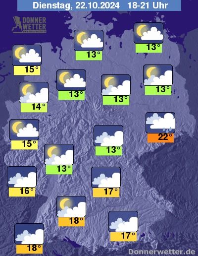 Heute Abend bleibt es südlich des Mains und über Sachsen stark bewölkt, dazu fällt aber kaum noch Regen. Weiter nach Norden und Westen hin ist der Himmel meist leicht bis wechselnd bewölkt, hierbei bleibt es trocken. Die Temperatur liegt bei 13 Grad in der Norddeutschen Tiefebene und bis 22 Grad in der Lausitz.