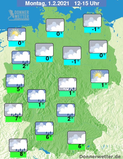 Heute Nachmittag bleibt es bis auf einzelne Auflockerungen über Sachsen bedeckt und es bleibt nur im Norden und Osten weitgehend trocken, sonst fällt zeitweise Regen, zum Teil auch Schneeregen oder Schnee. Die Temperatur steigt auf -1 Grad an der Müritz und bis 8 Grad am Oberrhein.