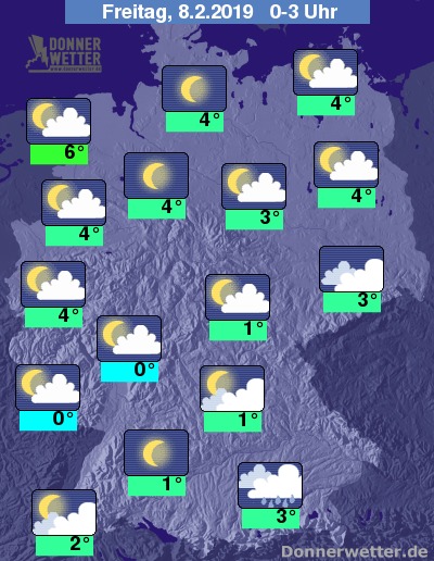 In der Nacht zeigt sich der Himmel meist locker bewölkt, über der Nordhälfte sowie dem Schwarzwald kann es im Verlauf auch aufklaren. Dichtere Wolken halten sich meist nur an den Alpen sowie zeitweise über dem Erzgebirge. Es bleibt meist trocken, kräftigere Schauer sind nur im Alpenvorland zu erwarten.