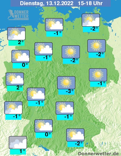 Die Temperaturen erreichen Höchstwerte um -3 Grad im Thüringer Becken und 2 Grad im Rheinland.