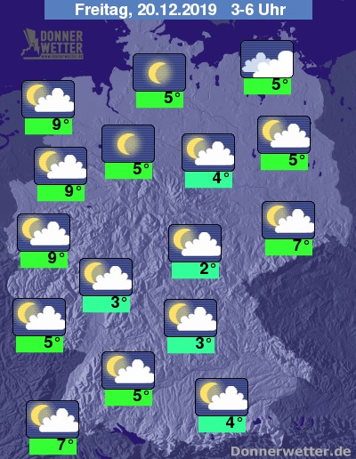 In der Nacht zeigt sich der Himmel über weiten Teilen des Landes locker oder aufgelockert bewölkt, an der Weser kann es gebietsweise auch aufklaren. Es bleibt trocken. Es weht ein meist schwacher Wind aus Ost/Südost; in der Lausitz, im Zittauer Gebirge sowie am Alpenrand sind auch frische bis stürmische Böen möglich.