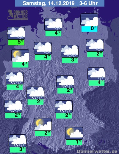 Während der Frühstunden liegen die Temperaturen meist so zwischen 1 und 6 Grad. Am kältesten wird es dabei in den Aufklarungsgebieten des Südens, am mildesten bleibt es in den Ballungsgebieten des Westens.
