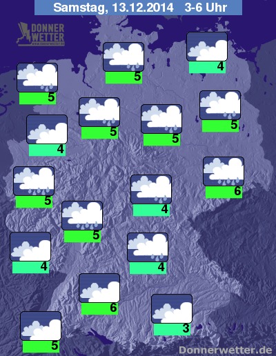 In der Nacht zum Samstag bleibt es bei weitgehend dichter Bewölkung und es fällt auch immer wieder Regen, im Süden bleibt es zum Großteil trocken. Der Wind nimmt bis zum Morgen weiter ab und weht noch meist mäßig bis frisch, an der See auch oft stark mit stürmischen Böen. Die Temperatur sinkt auf 6 Grad in Dresden und 3 Grad in München.