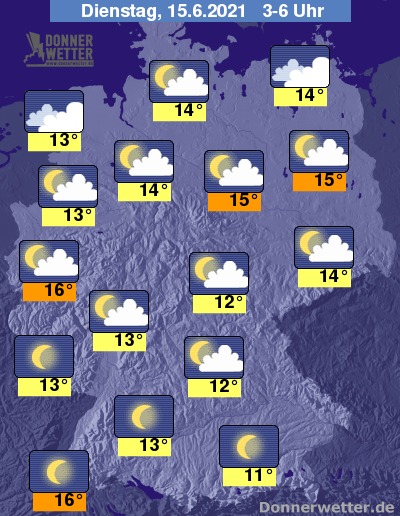 In der Nacht zum Dienstag ist der Himmel im Süden meist sternenklar, sonst ist es überwiegend locker oder aufgelockert bewölkt. Es bleibt landesweit trocken bei Tiefstwerten von 16 Grad in Bonn und etwa 11 Grad in Augsburg.