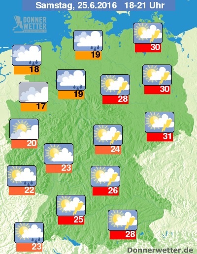 Heute Abend ändert sich an wettertechnisch nur wenig. Über dem Nordosten bleibt es weitgehend bedeckt und es fällt zeitweise Regen. Im großen Rest des Landes ziehen oft dichte, teils aufgelockerte Wolken durch, es können sich wiederholt Schauer und stellenweise auch Gewitter bilden. Die Temperatur liegt bei 17 Grad am Teutoburger Wald und etwa 31 Grad in Hoyerswerda.