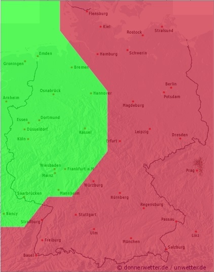 Die Unwetter wollen einfach nicht enden. Der Deutsche Wetterdienst warnt für den Nachmittag vor schweren Gewittern in der gesamten Osthälfte des Landes. Dabei muss mit heftigem Starkregen, Hagel und lokal auch Sturmböen gerechnet werden. Verschont bleibt hingegen die Westhälfte von Ostfriesland bis ins Saarland.