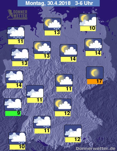In der Nacht zum Montag bleibt der Himmel von Bayern bis nach Sachsen meist locker bewölkt oder sternenklar und dazu auch trocken. Über dem Westen und Norden halten sich dagegen meist dichte Wolken und es bilden sich vielerorts Schauer sowie einzelne Gewitter. Im übrigen Land ist es teils aufgelockert, teils stark bewölkt, aber weitgehend trocken. Die Temperatur sinkt auf 17 Grad in Dresden und bis 9 Grad am Pfälzer Wald.