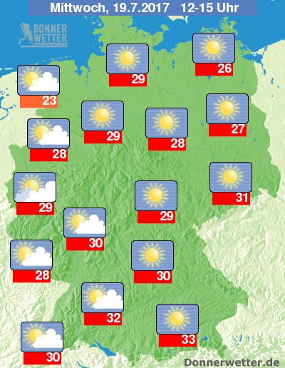 Heute Mittag ist es verbreitet heiter bis sonnig, in den westlichen Landesteilen ziehen hier und da einige Wolken auf, dabei bleibt es aber trocken. Die Temperatur liegt bei 23 Grad an der Nordsee und bis 33 Grad in München.