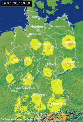 Im weiteren Nachmittagsverlauf dehnen sich die Gewitter aus, betroffen ist dann eine Linie zwischen dem Rheinland und der Lüneburger Heide.