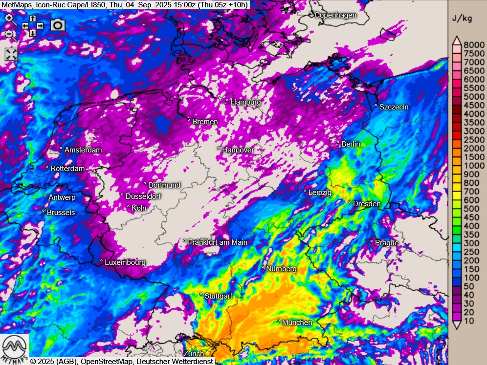 Die Cape/Lifted-Karte sowie die Lufttemperaturkarte nach ICON-RUC und GFS für Donnerstagnachmittag (15:00 Uhr):