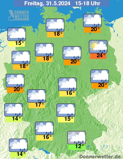 Die Temperaturen erreichen bei Dauerregen Höchstwerte um 12 Grad am Alpenrand und 24 Grad in Berlin.