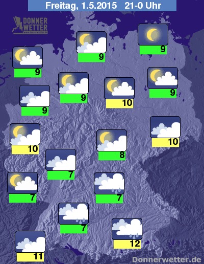 Heute Abend ziehen über Süddeutschland noch häufig dichte Regenwolken, die besonders am Bayerischen Wald und am Alpenrand auch langanhaltenden Regen bringen, weiter nach Norden ist es oft stark, hier und da aber auch aufgelockert bewölkt und es bleibt trocken. An den Küsten ist es sogar meist sternenklar. Die Abendtemperatur liegt bei 12 Grad in München und um 7 Grad am Odenwald.
