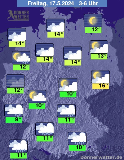 In der Nacht auf Freitag zeigt sich der Himmel über dem Westen und Süden stark bewölkt oder es ist bedeckt, dabei muss anfangs noch verbreitet mit Gewittern gerechnet werden. In den südlichen Landesteilen fällt in der Nacht teils anhaltender und kräftiger Regen mit lokalem Unwetterpotential! Im Norden und Osten bleibt es bei meist geringer Bewölkung niederschlagsfrei.