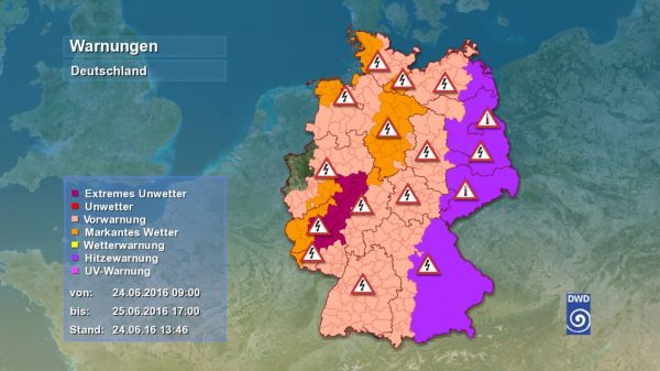 Während es für weite Teile der östlichen Bundesländer verbreitet Hitzewarnungen mit Werten von teils über 35 Grad C gibt, besteht für die meisten anderen Landesteile lediglich eine Vorwarnung, gebietsweise aber auch ein Risiko für markantes Wetter. Hier sind demnäch auch teils schwere Gewitter möglich. Die höchste Warnstufe gilt derzeit jedoch für Teile Westdeutschlands, hierbei insbesondere das östliche Rheinland-Pfalz und das westliche Hessen. Hier sind örtlich unwetterartige Gewitter möglich.