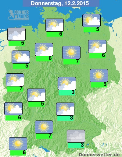 Ein zumeist regenfreier Mix aus Sonne und Wolken begleitet die Karnevalsjecken an Weiberfastnacht. Dabei gibt es vor allem in den Hochburgen durchaus draußentaugliche Temperaturen. Im Tagesverlauf steigen die Höchstwerte auf 3 °C im Thüringer Wald und um 7 °C in Köln.
