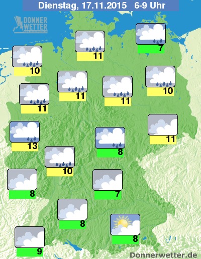 Die Temperaturen liegen bei Werten um 13 Grad C im Rheinland und 7 Grad C an der Ostseeküste.
