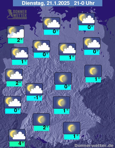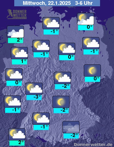 In der Nacht zum Mittwoch bleibt der Himmel über den nördlichen Landesteilen stark bewölkt oder bedeckt, dabei kann lokal etwas Sprühregen oder Schneegriesel fallen. In den übrigen Landesteilen ist es sternenklar oder nur gering bewölkt, dabei bleibt es niederschlagsfrei. Gebietsweise kann sich Nebel oder Hochnebel bilden.