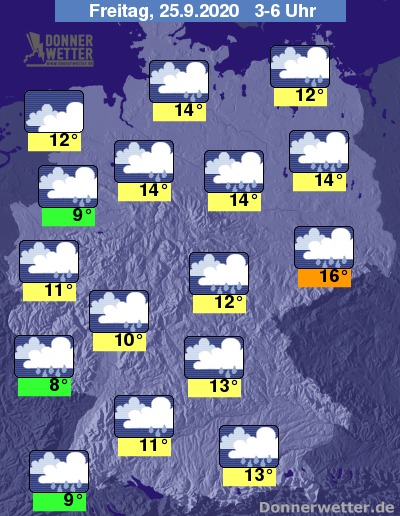 Bis zu den Frühstunden kühlt die Luft auf 6 Grad im Saarland und immer noch milden 15 Grad in Teilen von Sachsen ab.