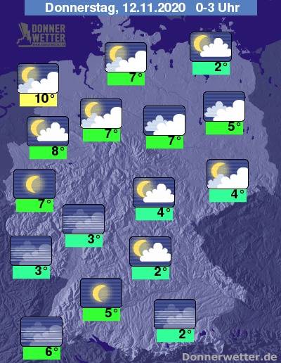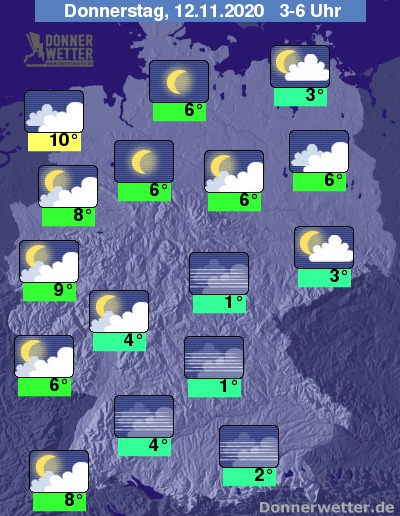 Während der zweiten Nachthälfte breiten sich in den Aufklarungsgebieten des Südens und der Mitte neue teils dichte Nebelfelder aus. Im Norden bleibt es eher wechselnd bewölkt,entlang der Weser kann es in den frühen Morgenstunden auch aufklaren.