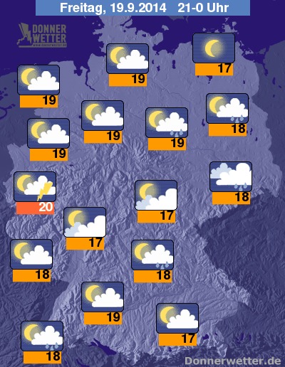 Heute Abend bleibt es nach Nordosten hin noch weitgehend sternenklar und trocken, sonst ziehen aber schon mehr Wolken nach Norden, diese bringen jedoch kaum Regen. Gebietsweise Schauer und Gewitter bilden sich bevorzugt vom Schwarzwald, über Franken bis nach Sachsen und weiter nach Berlin-Brandenburg, sonst ist es meist aufgelockert bewölkt und überwiegend auch trocken.